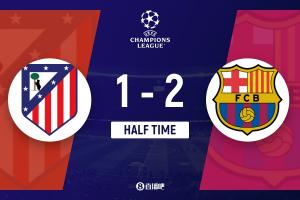 半场结束,巴萨暂2-1马竞。